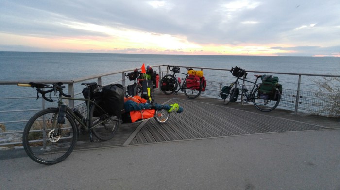 Nous avons finalement terminé la route de nuit, sur une voie verte qui longeait les dunes. Heureusement qu’une warmshower avait accepté de nous héberger tous les quatre 🙂
