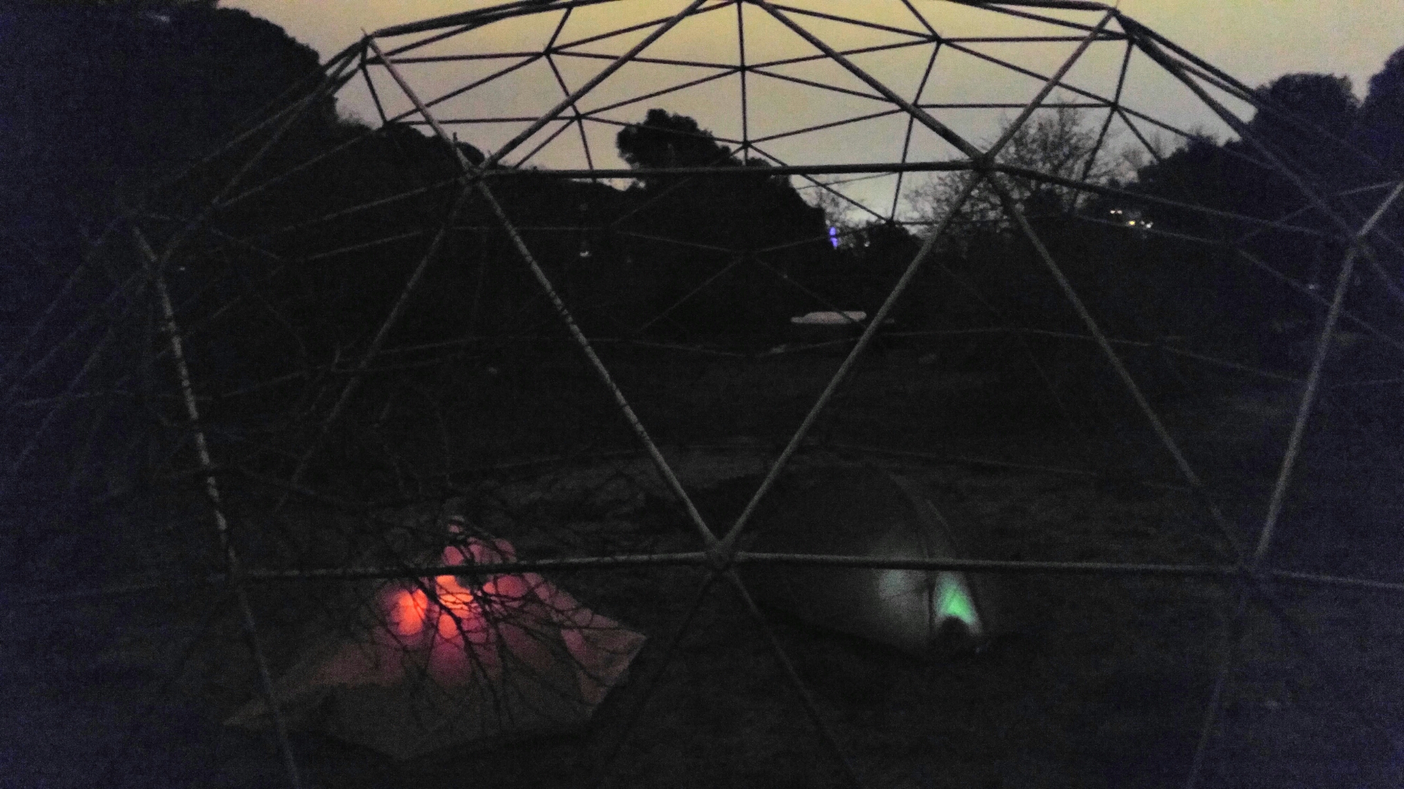 Rendus à la grande porte d’entrée, nous cognons et on nous répond par la fenêtre du premier. Nous ne pouvons entrer nous réchauffer (parce qu’ils sont en train de faire d’étranges expériences? que je me demande), mais on peut camper sous le dôme…