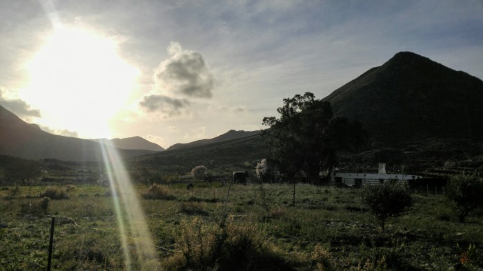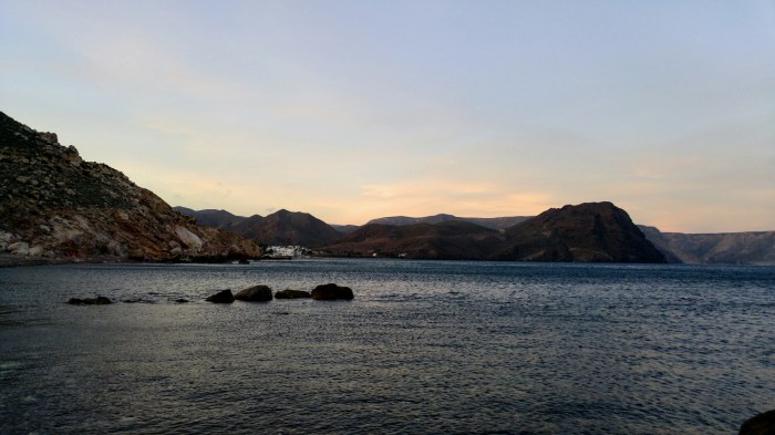Nous descendons donc les derniers kilomètres les freins dans le tapis, en espérant ne pas être emportés par le vent. Arrivés à destination, nous trouvons notre camping, enclavé dans les montagnes, sur le bord de l’eau. Il vente toujours, mais au moins nous sommes en sécurité 🙂 en plus, paraît qu’il y a un bus demain matin 7:40 pour Almería. J’espère du plus profond de mon cœur que le chauffeur acceptera nos vélos!