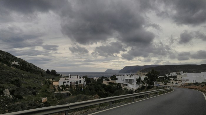 Nous prenons aujourd’hui la route pour le Parque national Cabo de Gata, dont plusieurs cyclos nous ont vanté la beauté. La journée commence en force avec une grosse montée, dont la vue sur Carboneras est magnifique.