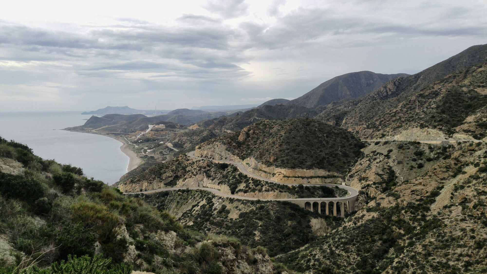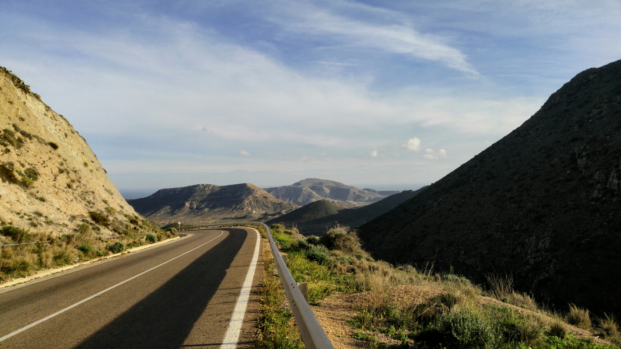 Nous prenons aujourd’hui la route pour le Parque national Cabo de Gata, dont plusieurs cyclos nous ont vanté la beauté. La journée commence en force avec une grosse montée, dont la vue sur Carboneras est magnifique.
