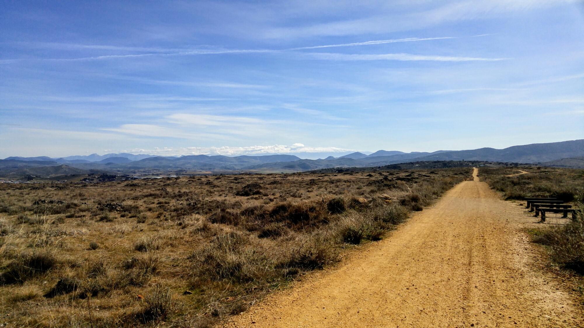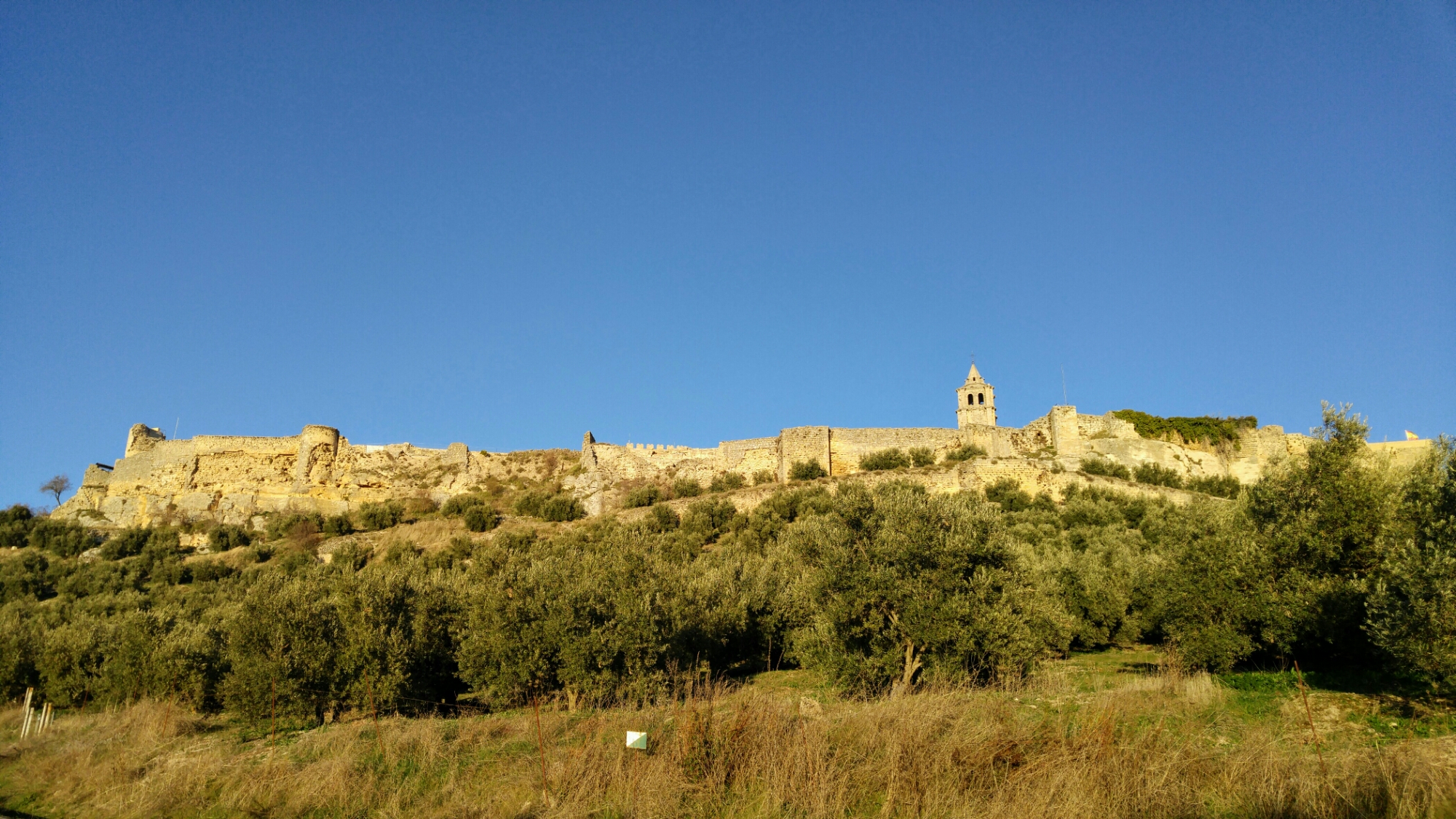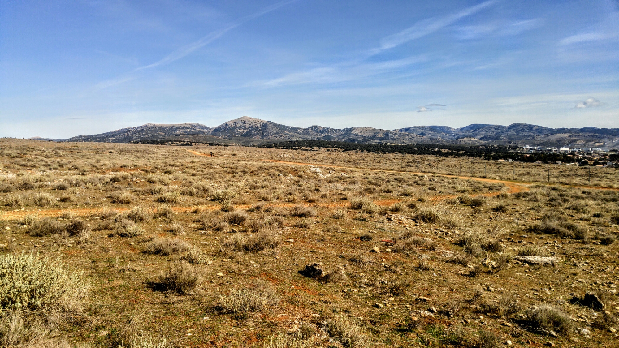 Au sommet se trouve un grand plateau et les gens du coin, de tous les âges, viennent s’y promener, y courir, y faire du vélo, y dessiner. De là, il est possible d’avoir une vue sur les villages avoisinants, sur les oliveraies, sur les montagnes, dont la splendide Sierra Nevada enneigée. La végétation est gris-verdâtre et le sol toujours aussi intense, ocre.