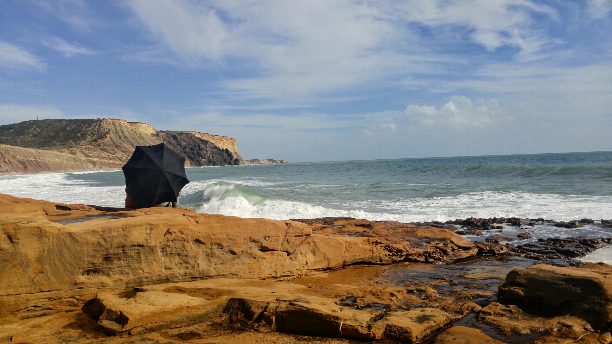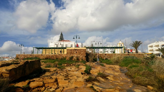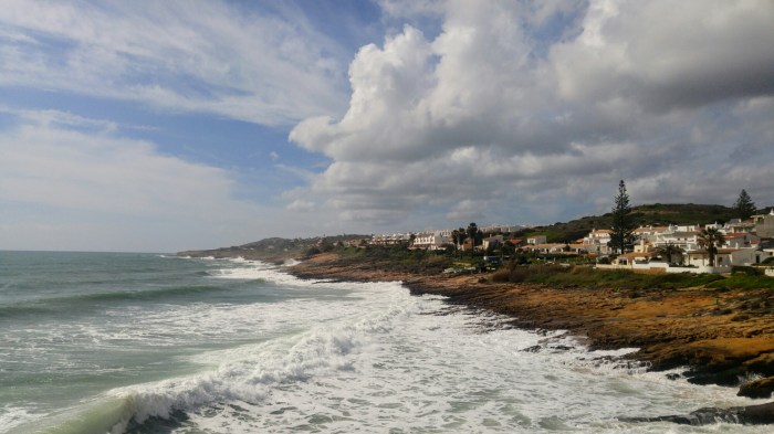 Comme c’est beau! Et comme ça fait du bien de voir autour de soi (contrairement aux derniers jours…)! Nous nous arrêtons à Luz pour manger un peu, puis repartons rouler sous le chaud soleil portugais. La mer est d’un bleu-vert exquis et les falaises sont oranges. J’a-dore.