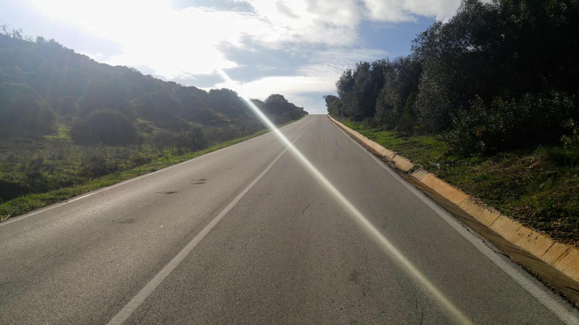 Sauf une. Sur la première photo, on peut voir, derrière le rayon de soleil, la montée qui nous attend. Un joli 20% tout rond.