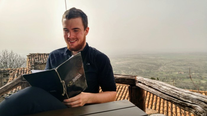 Nous mangeons un délicieux dîner très haut perchés, puis montons à pieds jusqu’au sommet, où on trouve les vestiges d’un château des Templiers.