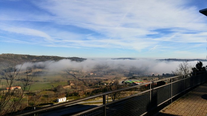 Nous nous dirigeons vers la gare, tout en bas de la ville; pour ce faire nous devons traverser les nuages! Et il fait encore plus froid!