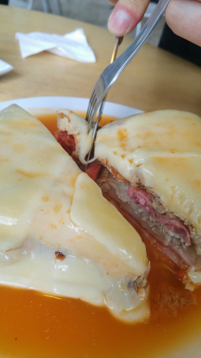 Visite de Porto aujourd’hui! Sans itinéraire précis, nous avons déambulé dans la ville une bonne partie de la journée. Mais d’abord, time to eat ! Nous avons mangé, ou plutôt dévoré, une Francesinha, sandwich typique de Porto. Plein de sortes de viandes, enrobée dans du fromage fondu et recouverte d’une sauce orange, cette sandwich était un délice.