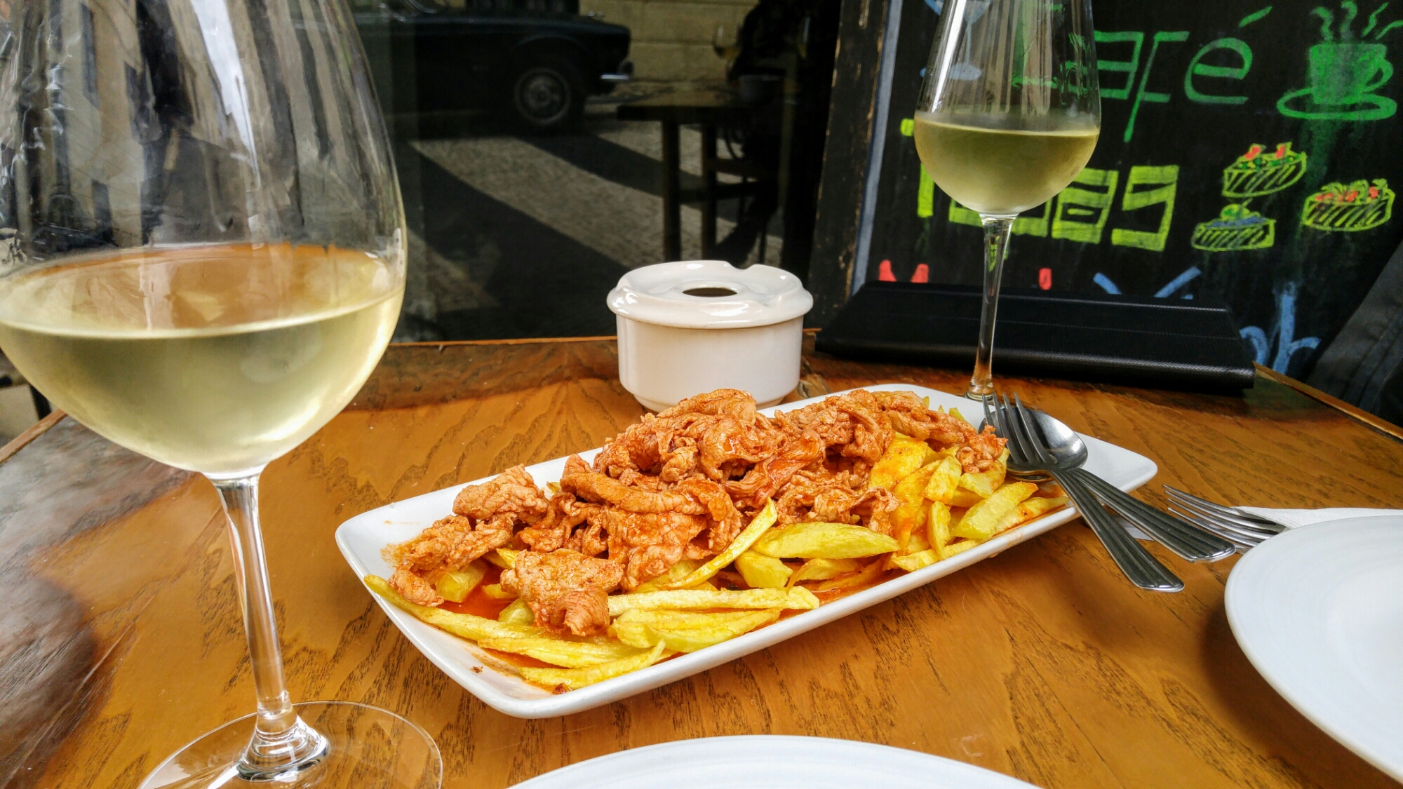 Visite de Porto aujourd’hui! Sans itinéraire précis, nous avons déambulé dans la ville une bonne partie de la journée. Mais d’abord, time to eat ! Nous avons mangé, ou plutôt dévoré, une Francesinha, sandwich typique de Porto. Plein de sortes de viandes, enrobée dans du fromage fondu et recouverte d’une sauce orange, cette sandwich était un délice.