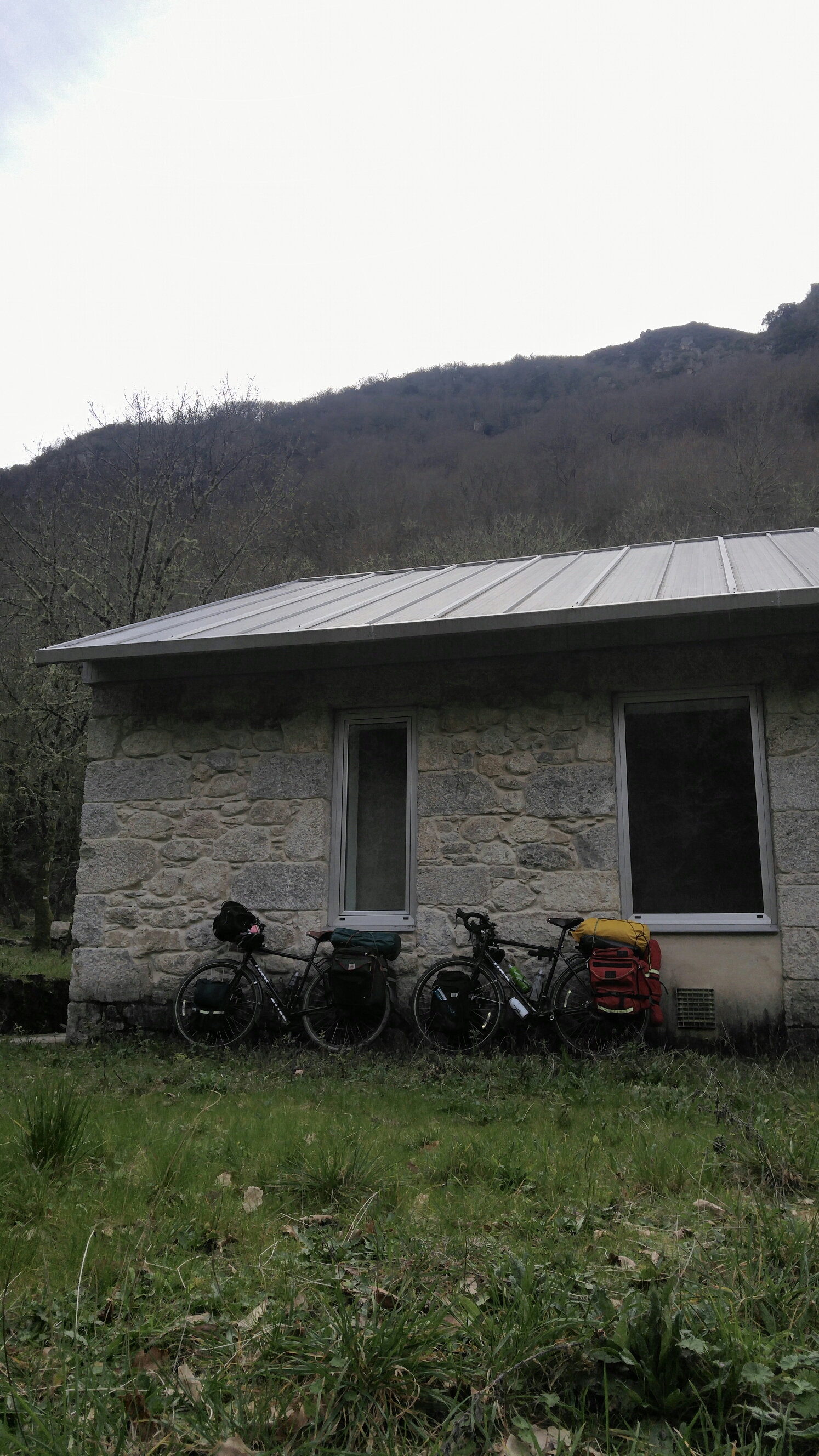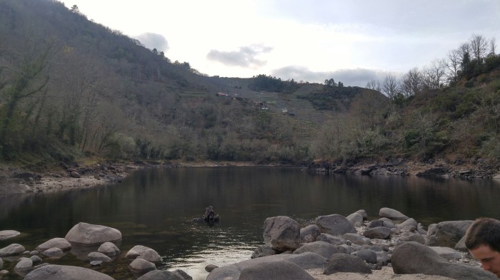 Nous arrivons en début de soirée à la Fabrica da Luz, une ancienne petite centrale hydroélectrique qui sert aujourd’hui d’auberge. Comme elle est fermée l’hiver, nous montons notre tente juste à côté, puis allons marcher le long de la rivière… C’est pas parce qu’on est morts de fatigue qu’on ne peut pas explorer…!