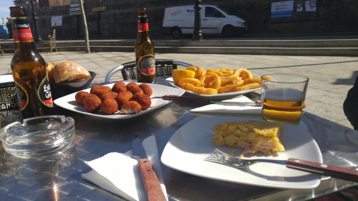 On descend donc sur 3 kilomètres pour remonter pendant 6… Évidement, à notre arrivée, c’est la siesta! Toutes les épiceries sont fermées. Nous nous dirigeons donc vers le premier café d’ouvert et engloutissons, assis au gros soleil, de la bière, une pointe d’omelette espagnole, des calemars gris et des croquetas jambon-fromage.