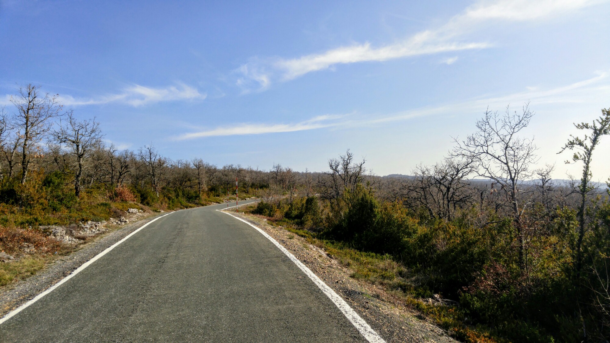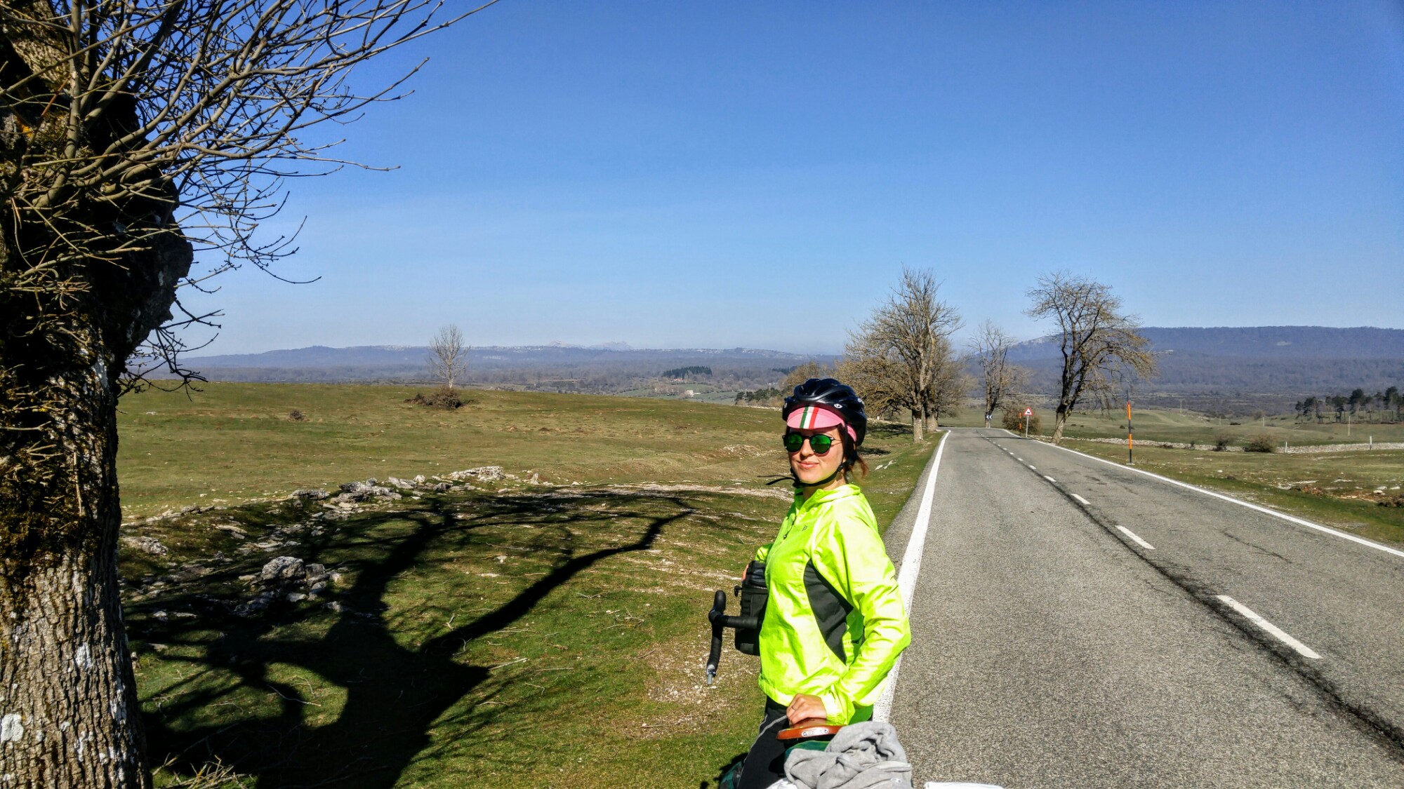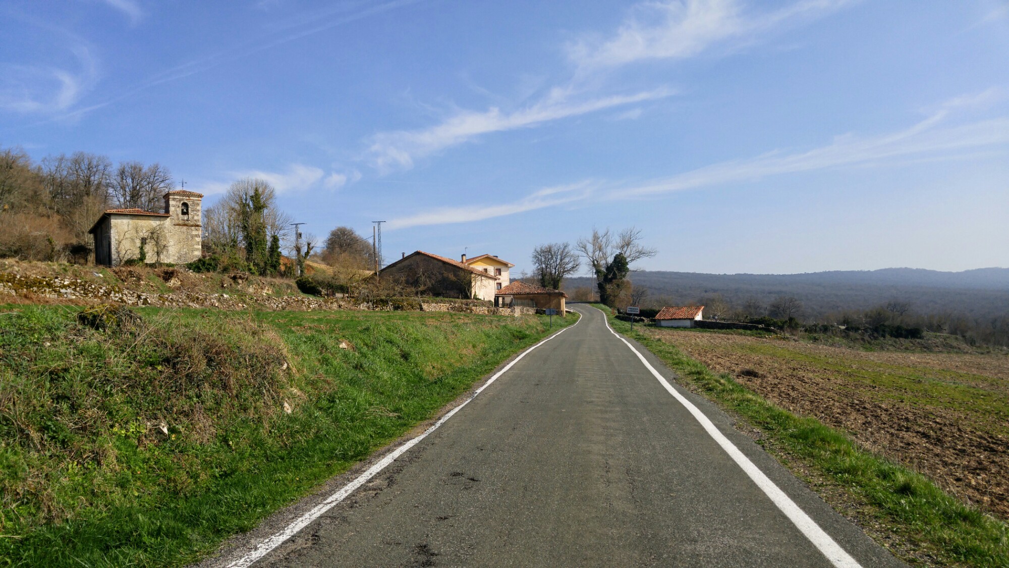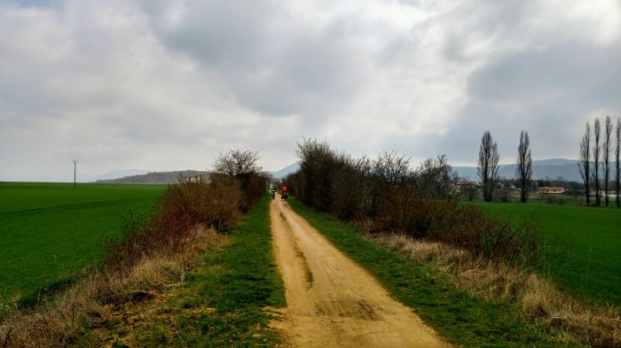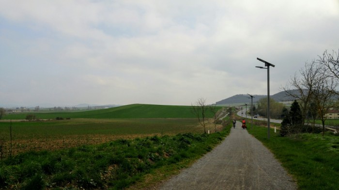 Nous roulons durant une vingtaine de kilomètres sur le faux-plat ascendant d’une Via Verde, vent de face, entourés de terres agricoles qui commencent à verdir.