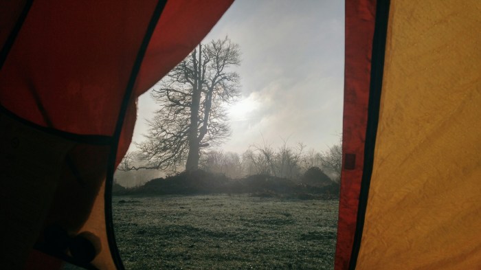 Le lendemain, nous nous levons après une nuit mouvementée : les hiboux, les voitures et le froid nous on fait la vie dure. Heureusement, tout est oublié lorsque j’ouvre la tente et que je vois le soleil qui pointe à travers le brouillard et la givre au sol; waw!