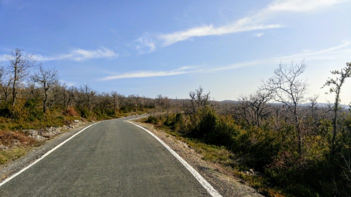 Ça monte pendant un petit bout, jusqu’à une carrière, où le passage des non-camions est interdit. Sauf que c’est pas mal le seul moyen pour nous de nous rendre à destination… Faique on y va quand même!