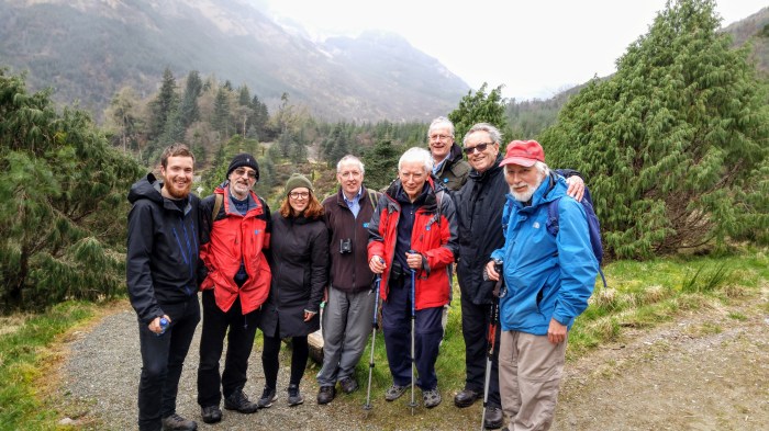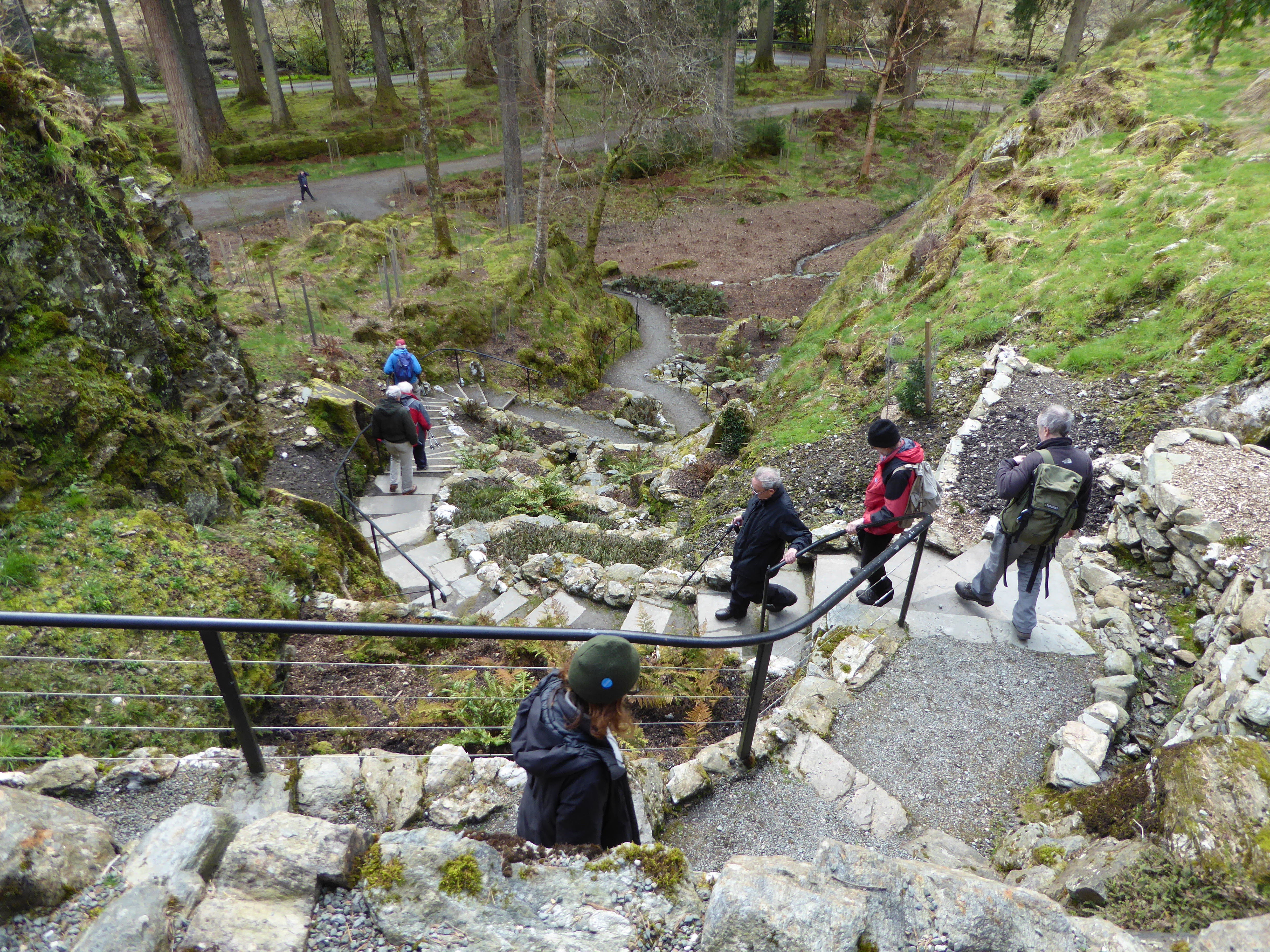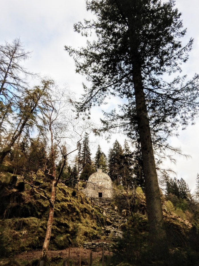 Rendus au premier belvédère, nous faisons la rencontre d’un groupe d’amis-retraités fort sympathiques. Nous échangeons un peu et poursuivons notre route. Nous les recroisons un peu plus loin et, comme il se met à pleuvoir, nous nous mettons tous à l’abri sous la petite chapelle; cela nous permet de discuter davantage! Nous leur parlons de notre voyage à vélos et de nos aventures, ils nous parlent de l’Écosse et de l’histoire du jardin.