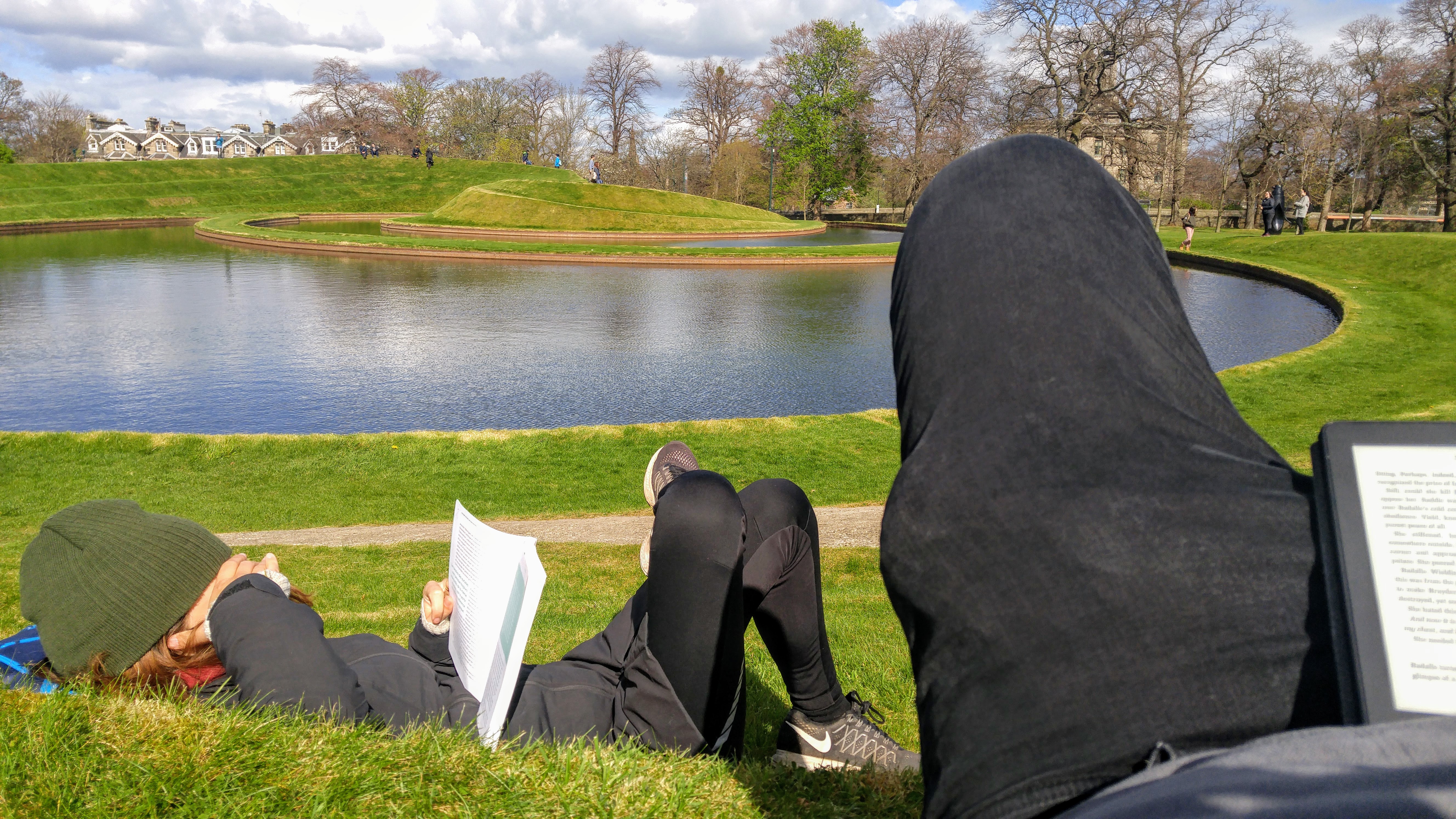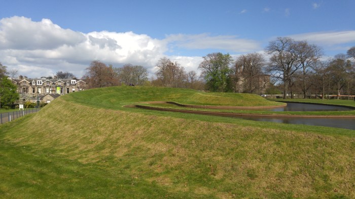 Nous sommes ensuite allés à la Scottish National Gallery of Modern Art One, où j’ai été très surprise par l’aménagement du terrain avant, soit l’oeuvre Landform, de Jencks, une série de grands serpentins étagés qui se reflète dans un bassin d’eau. Enfants comme adultes y jouent, s’y posent pour lire et contempler les lieux.