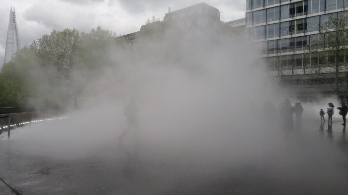 À notre sortie du musée, nos regards sont attirés par ce qu’il se passe dehors: un espèce d’épais brouillard se lève sur la place extérieure et les gens s’y rassemblent, les enfants courent en poussant de petits cris de joie et tout le monde rit. Nous nous joignons à eux, au coeur de l’oeuvre de l’artiste japonaise Nakaya, dont l’objectif de ce « living artwork » était que les gens interagissent avec leur environnement. Je dis chapeau! car c’est très réussi.