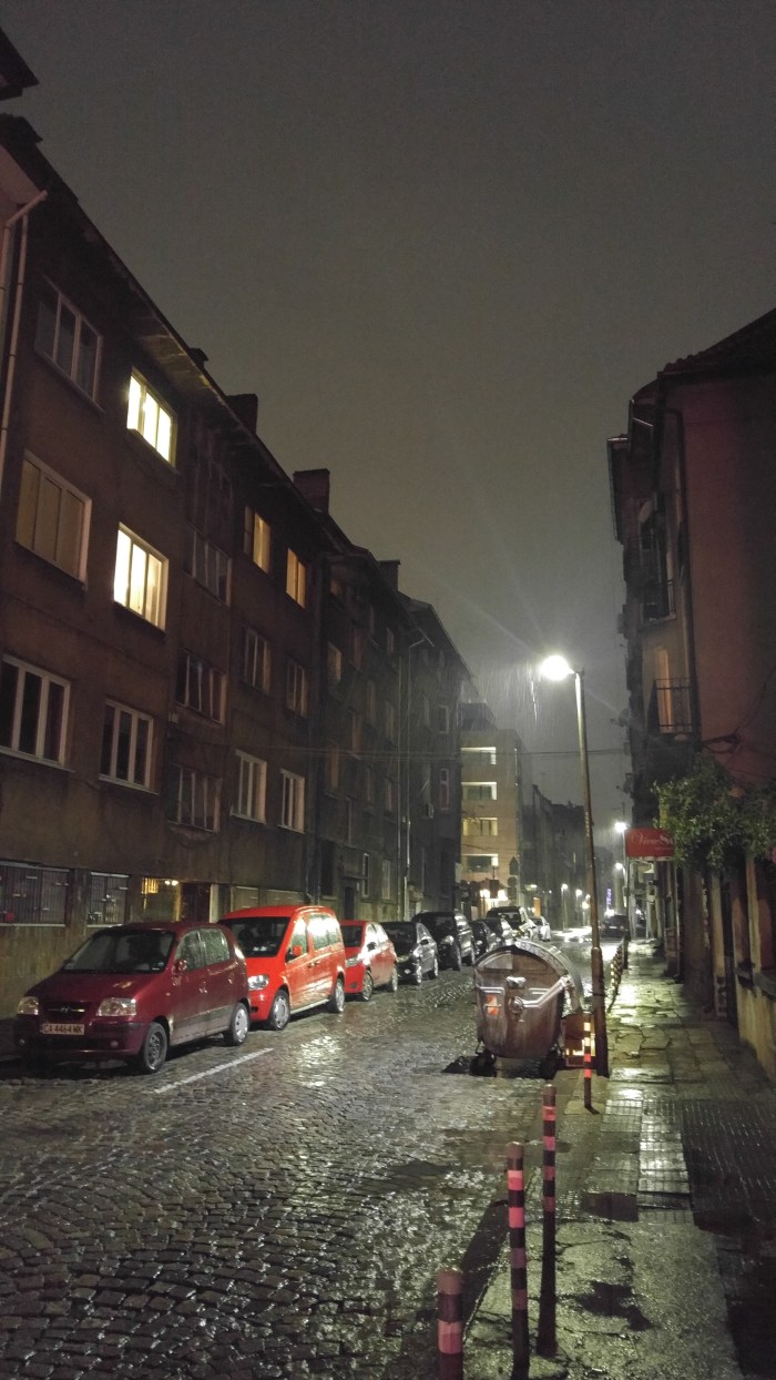 Nous nous installons confortablement dans note chambre, où nous faisons une longue sieste, au son de la pluie qui fracasse la fenêtre. Nous ne ressortons qu’une fois la nuit venue, pour aller manger un excellent souper typiquement bulgare.